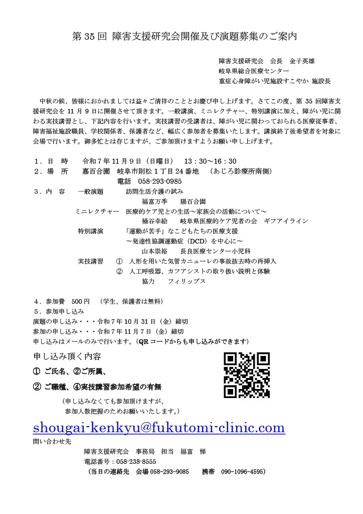 第35回 障害支援研究会参加募集のご案内です。2025.10.24 令和7年11月9日(日曜日)に第35回 障害支援研究会が開催されます。 参加申し込みは11月7日までとなります。 ご関心のある方は是非ご検討ください。 お問い合わせは、障害支援研究会 事務局までお願いします。 https://www.nagoya-schoolnursing.jp/wp-content/uploads/2024/12/logo01.png 0 0 サイト編集者 https://www.nagoya-schoolnursing.jp/wp-content/uploads/2024/12/logo01.png サイト編集者2025-10-24 09:57:412025-10-24 10:52:03第35回 障害支援研究会参加募集のご案内です。