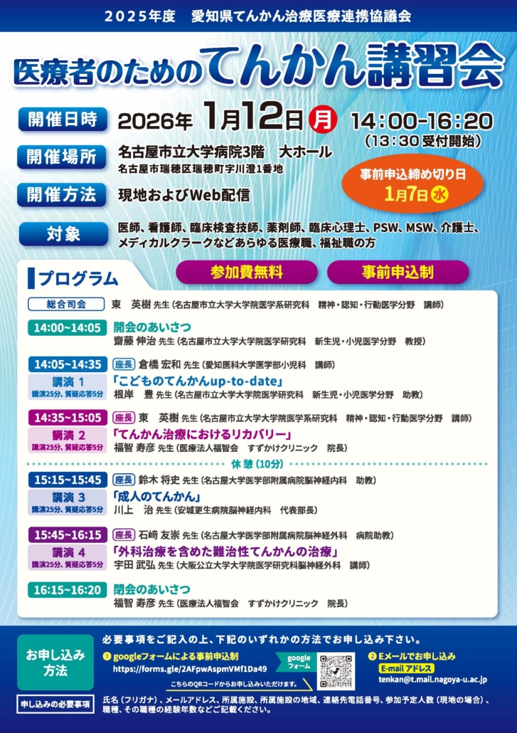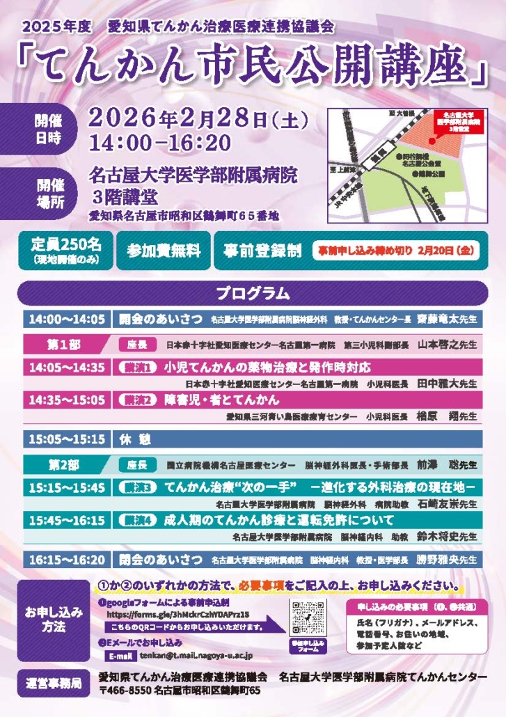 「医療者のためのてんかん講習会(1/12)」「てんかん市民公開講座(2/28)」のご案内です。2025.12.24 愛知県てんかん治療医療連携協議会が開催する講習会と市民公開講座のご案内です。 ご関心をお持ちのかたは是非ご参加ください。どちらも事前申し込みが必要です。 https://www.nagoya-schoolnursing.jp/wp-content/uploads/2024/12/logo01.png 0 0 サイト編集者 https://www.nagoya-schoolnursing.jp/wp-content/uploads/2024/12/logo01.png サイト編集者2025-12-24 18:51:052025-12-24 18:53:27「医療者のためのてんかん講習会(1/12)」「てんかん市民公開講座(2/28)」のご案内です。